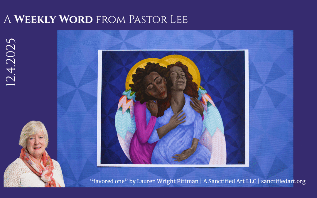 It was that emailed devotion that grabbed me on Tuesday. The image at the top of this reflection was created by the Sanctified Art artist Lauren Wright Pittman, and that day’s devotion contained her words about this artwork. It’s an image of the angel Gabriel with Mary, immediately after Mary has learned she will bear this son who will change the world.
